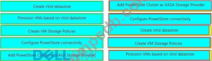 In vCenter, what is the correct order of steps to create a VM in a storage container provisioned on a Dell EMC PowerStore system?