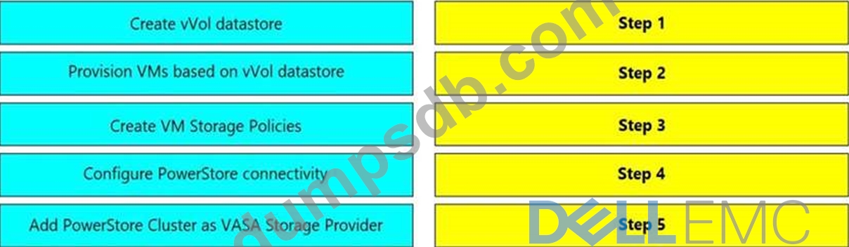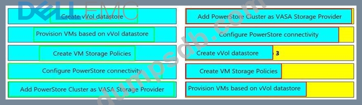In vCenter, what is the correct order of steps to create a VM in a storage container provisioned on a Dell EMC PowerStore system?