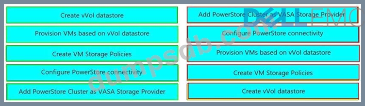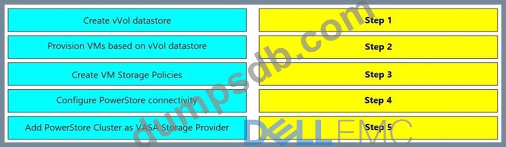 In vCenter, what is the correct order of steps to create a VM in a storage container provisioned on a Dell EMC PowerStore system?