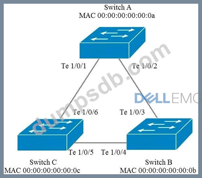 The exhibit represents a topology with all Dell EMC N4000 Series switches with RSTP enabled. In addition, the switches are using the default configuration on all ports and protocols.