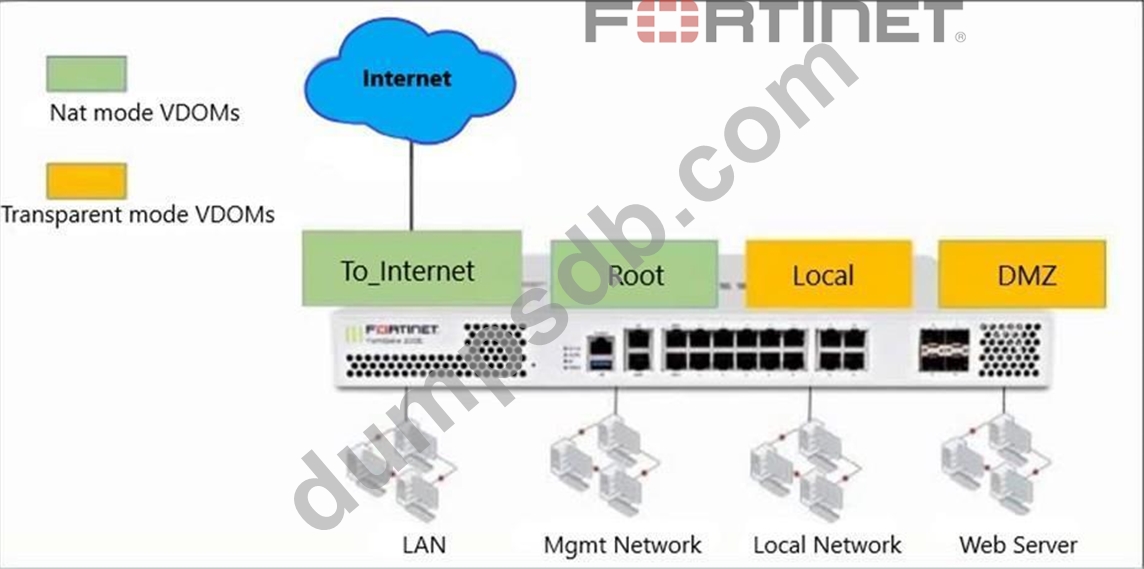 The Root and To_Internet VDOMs are configured in NAT mode. The DMZ and Local VDOMs are configured in transparent mode.