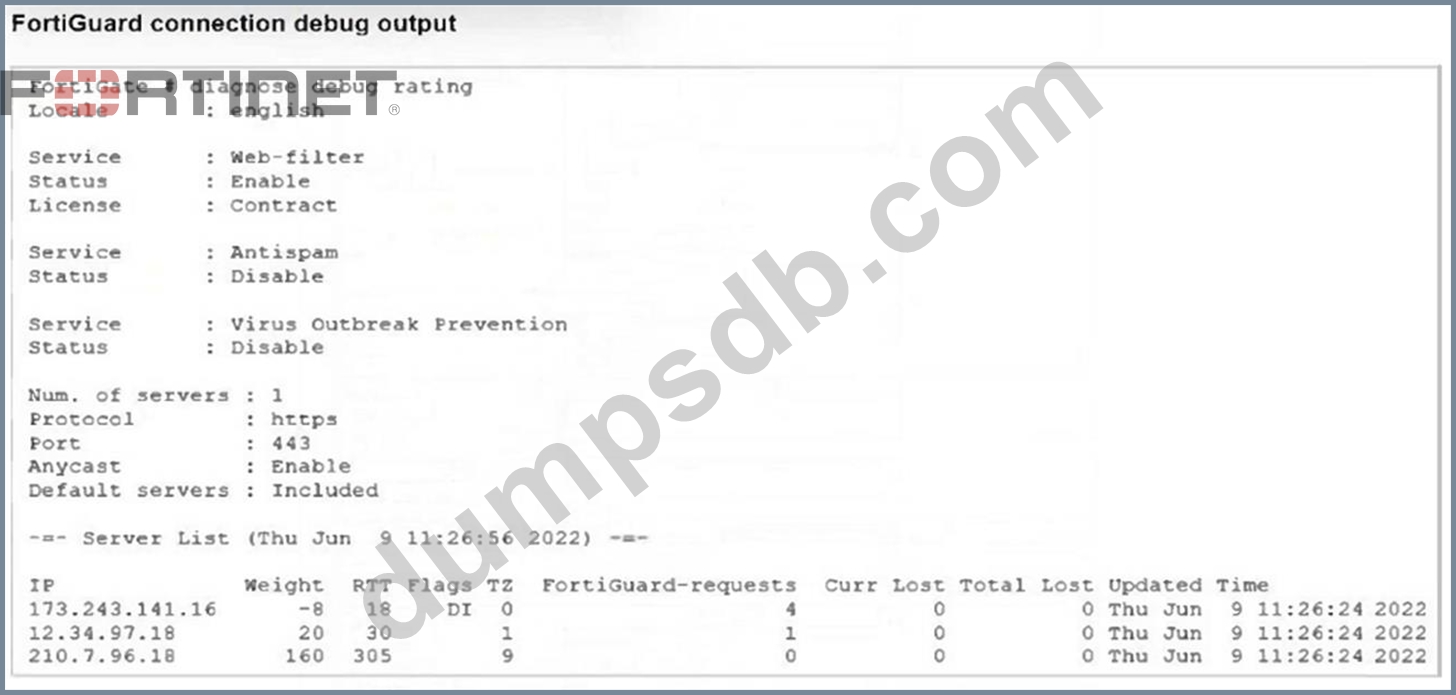 Refer to the exhibit showing a FortiGuard connection debug output.
