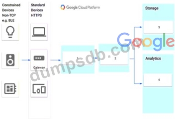 You are building a pipeline to process time-series data. Which Google Cloud Platform services should you put in boxes 1,2,3, and 4?