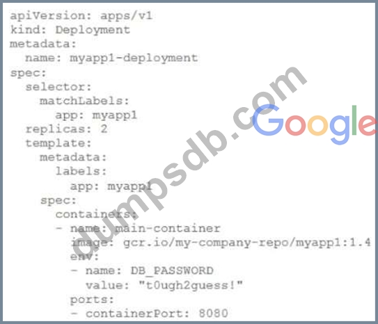 You need to refactor this configuration so that the database password is not stored in plain text. You want to follow Google-recommended practices. What should you do?