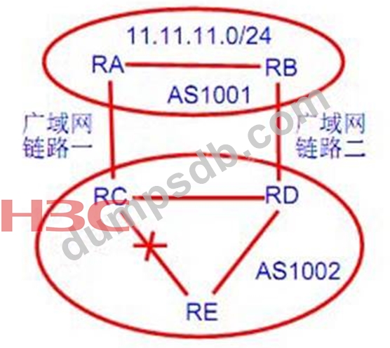 The networking is shown in the figure. RTA and RTB are located in AS 1001, RTC, RTD, and RTE are located in AS 1002. AS 1001 advertises BGP routes 11.11.11.0/24 to AS 1002. The main BGP configurations of RTC and RTD are as follows, if RTE , RTC's interconnection link is interrupted, RTE visits the 11.11.11.0/24 network segment, which wide area link is the priority to go through?