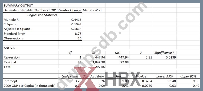 A journalist believes that it is possible to predict the number of Winter Olympic medals a country will win by analyzing the country's gross domestic product (GDP) per capita in the year prior to the Olympics. The journalist collects data on the 26 countries that won medals at the 2010 Winter Olympics and performs a regression analysis. The results for this regression are provided below.