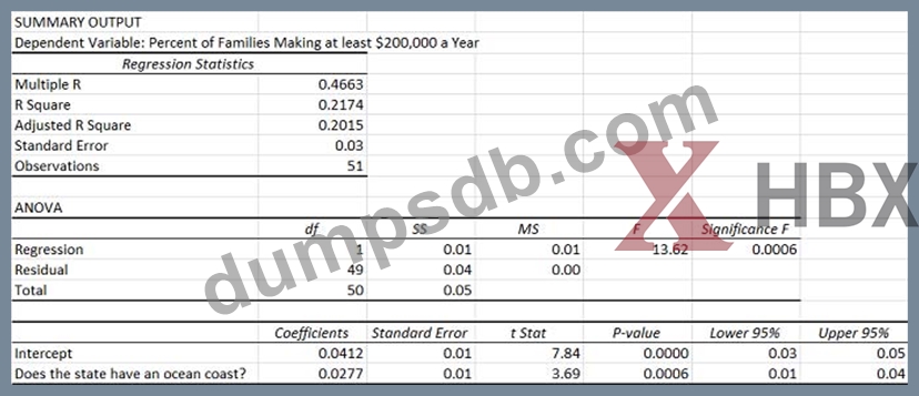 A landlocked student believes that people would prefer to live near the ocean if they could afford the additional expense. To test this, the student wants to see whether states bordering an ocean are more likely to have a larger percent of wealthy families than states without an ocean coast. The student collects data from the 50 U.S. states on the percent of families making over $200,000 a year along with whether the state has an ocean coast (where 1 means the state has an ocean coast).