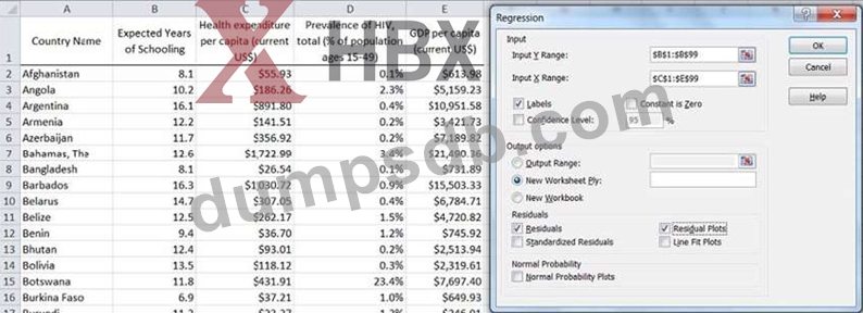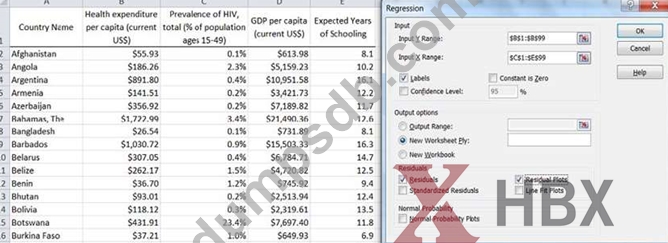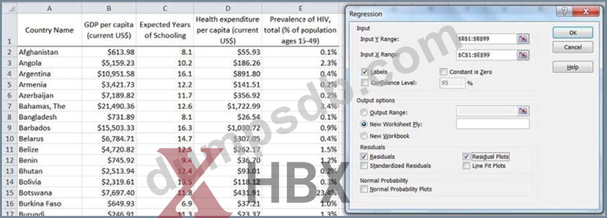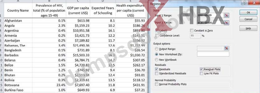 An organization focused on decreasing HIV in developing countries wishes to investigate the relationship between the prevalence of HIV and various education and economic factors. The organization collects data from 2011 for 98 different countries on the prevalence of HIV, as well as average years of schooling, gross domestic product (GDP) per capita, and health expenditures per capita, which they believe all have an impact on HIV prevalence. Which of the following options correctly runs the regression specified above?