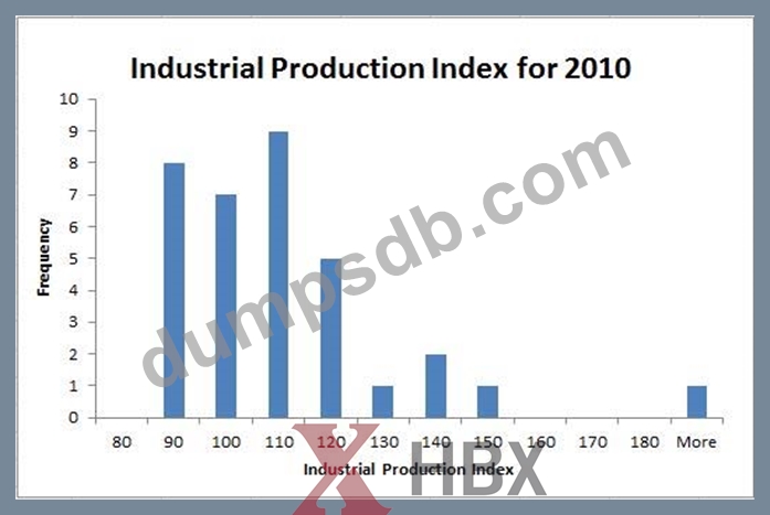 The histogram below shows the Industrial Production Index, which measures the output of the manufacturing, mining, and utilities industries for 34 selected countries. After confirming that the data are accurate, economists studying the results are debating how to handle the value for Iceland, 187.4.