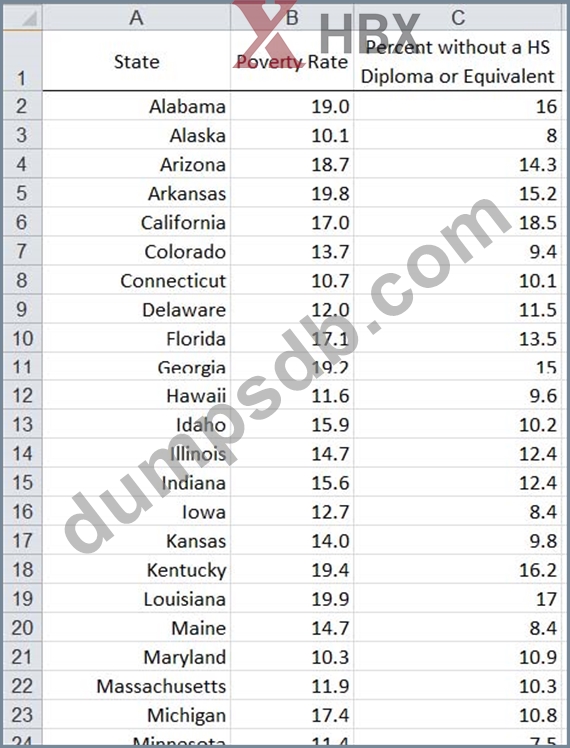 A high school teacher believes that the poverty rate in each U.S. state can be explained by the percentage of the population who do not have a high school diploma or equivalent. The teacher collects data from each of the 50 U.S. states; a portion of the data is given below.