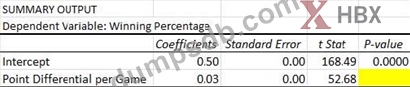 Below is a partial regression output table showing the relationship between a team's point differential and its winning percentage.(Point differential is defined as the difference between the average number of points a team scores per game and the average number of points per game scored against that team.)