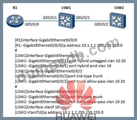 Refer to the graphic, after the ping 10.1.1.2 command is executed on R1, LSW1 receives a tagged data frame from VLAN 10 on LSW2.