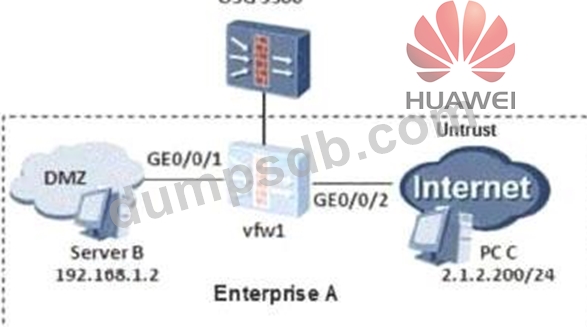 The networking diagram is as follows. The PC C of the enterprise A external network user needs to access the intranet DMZ area server B through NAT. To achieve this requirement, what are the following key configurations?
