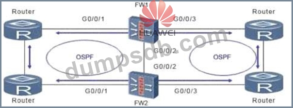 As shown in the figure, the firewall is dual-system hot standby. In this networking environment, all service interfaces of the firewall work in routing mode, and OSPF is configured on the upper and lower routers.