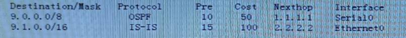 It is known that there are two entries in the routing table of a router. If the router wants to forward packets with the destination address of 9.1.4.5, which of the following statements is correct?