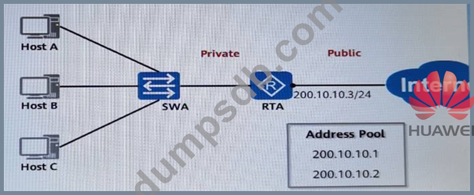 As shown in the figure, RTA uses NAT technology and realizes multiple-to-multiple NAPT address translation by defining an address pool, so that hosts in the private network can access the public network. Suppose that there are only two public IP addresses in the address pool, and they have been assigned to hosts A and B for address conversion, and if host C also wants to access the public network, which of the following description is correct?