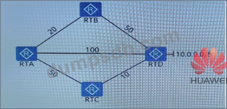 In the network shown in the figure below, all routers run the OSPF protocol, and the link cost value is shown in the figure. What is the cost value of the route entry to the network 10.0.0.0/8 in the RTA routing table?