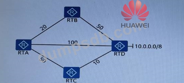 In the network shown in the figure below, all routers run OSPF protocol. Above the link is the value of the Cost value, then the path for RTA to reach the network 10.0.0.0/8 is: