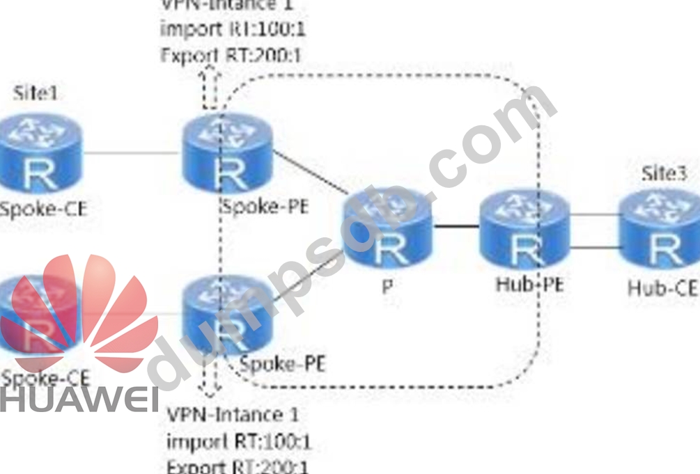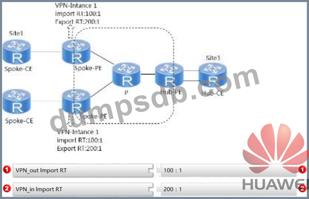 As shown in the figure, to enable the traffic between Site1 and Site2 to pass through the Hub-CE, VPN instances on two Spoke-PEs have been configured. Two VPN instances need to be created on the Hub-PE. The instance VPN in is used to receive routes from Spoke-PE, and the instance VPN out is used to advertise routes to Spoke-PE. Please select Import RT and Export RT for these two instances respectively. .