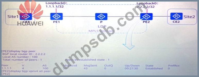 As shown in the figure, MPLS/BGP IPVPN is deployed in the network, and the MP-BGP neighbor relationship is established between PE1 and PE2 through the Loopback0 interface. After the configuration is complete, it is found that CE1 and CE2 cannot learn routes from each other. Use the command on PE2 Looking at the neighbor information as shown, what is the most likely cause of the problem?