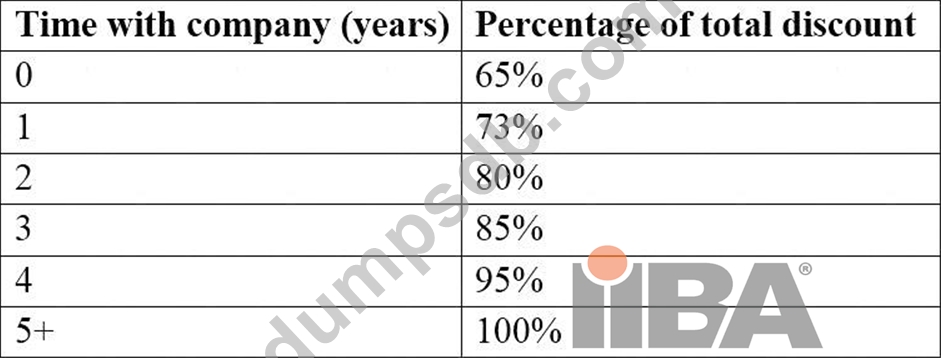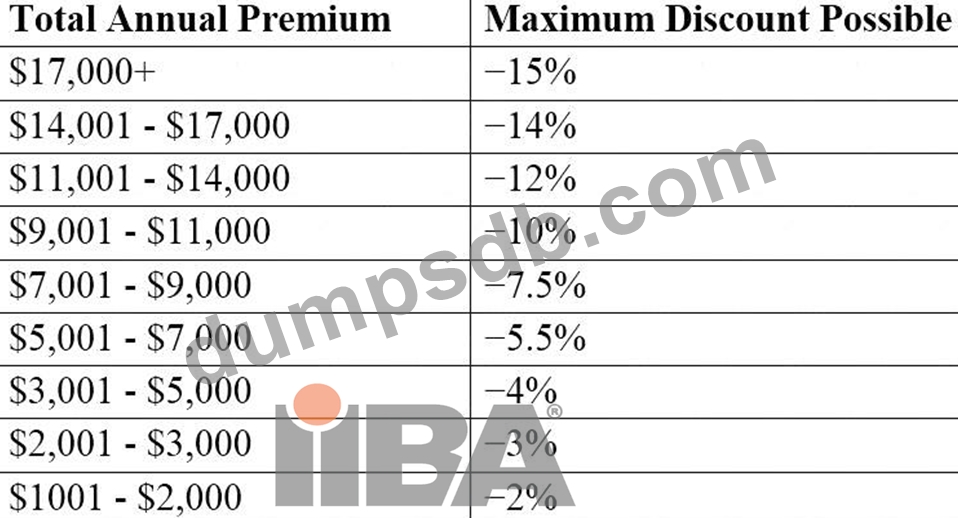 A business analyst (BA) works with stakeholders such as actuaries, product specialists, sales staff, risk managers, and underwriters who agree to applying varying levels of discounts to customers based on: