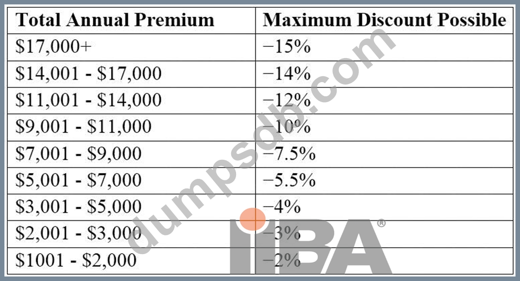 A business analyst (BA) works with stakeholders such as actuaries, product specialists, sales staff, risk managers, and underwriters who agree to applying varying levels of discounts to customers based on: