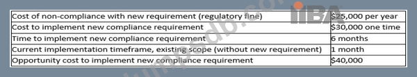 Due to a change in regulation, a solution being implemented has a new compliance requirement that must be evaluated. The requirements change strategy focuses on total cost of change as the primary driver for decisions. The business analyst (BA) compiled the following impact assessment of the proposed change based on the new compliance requirement.