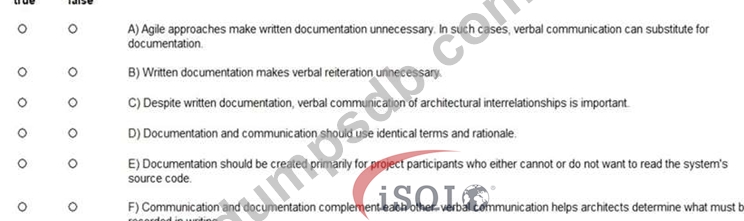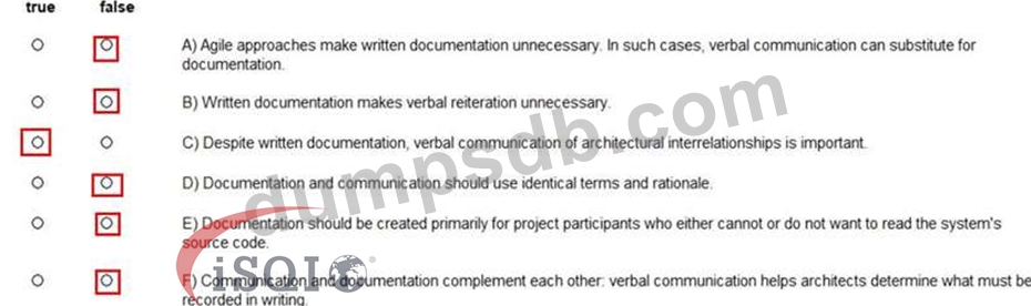 How are written documentation and verbal communication of software architectures related? Please mark the following statements as true or false. (Assign all answers.)