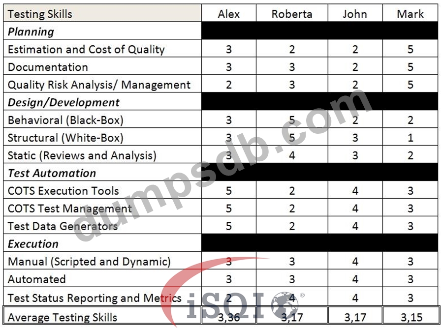 Consider the following analysis of testing skills performed on four people: Alex, Robert, John and Mark (all the skills have been rated on an ascending scale: The higher the score, the better the skill):