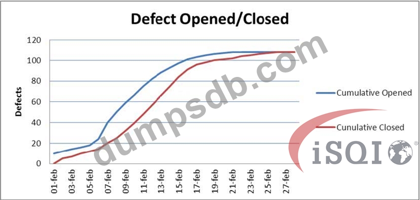 The following chart plots the cumulative number of defects opened against the cumulative number of defects closed during system testing of a software product.