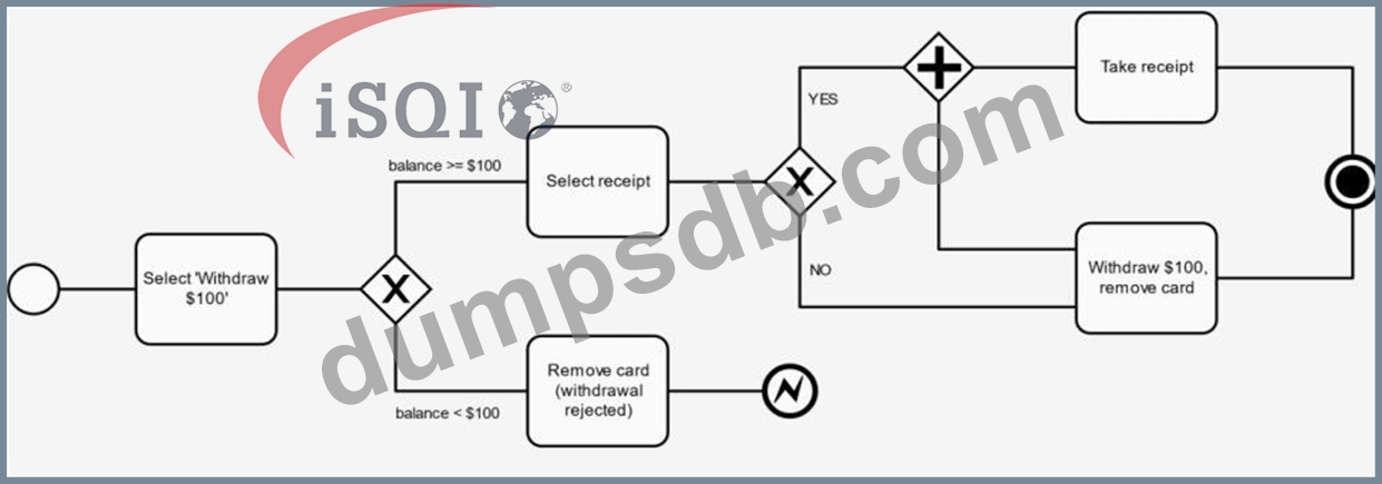 As an acceptance tester you want to test the $100 withdrawal process described by the following Business Process Model and Notation (BPMN) model.