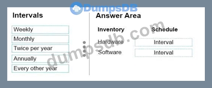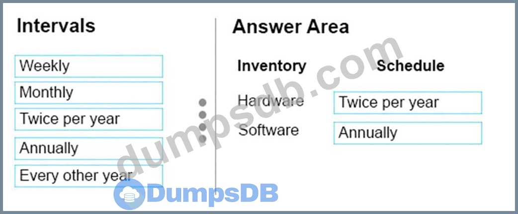 Which schedule interval should you implement for each inventory type? To answer, drag the appropriate intervals to the correct inventory types. Each interval may be used once, more than once, or not at all. You may need to drag the split bar between panes or scroll to view content.