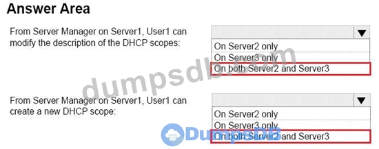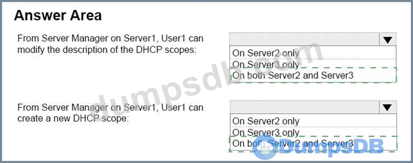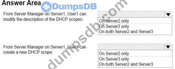 On Server1, you create a security policy for User1. The policy grants the IPAM DHCP Scope Administrator Role with the \Global access scope to the user.