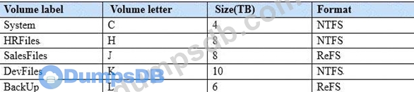 You manage a file server that runs Windows Server 2016. The file server contains the volumes configured as shown in the following table.