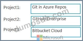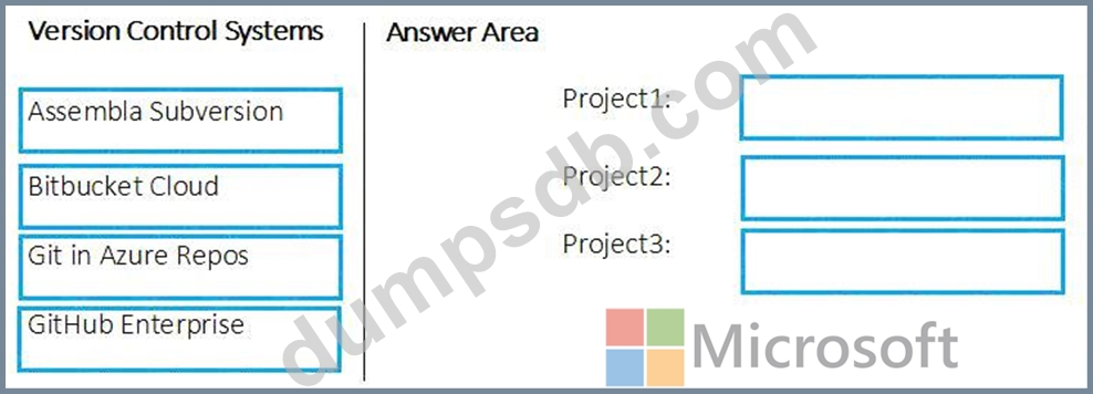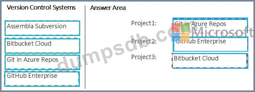 Which version control system should you recommend for each project? To answer, drag the appropriate version control systems to the correct projects. Each version control system may be used once, more than once, or not at all. You may need to drag the split bar between panes or scroll to view content.