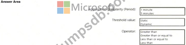 How should you configure the alert rule? To answer, select the appropriate options in the answer area.