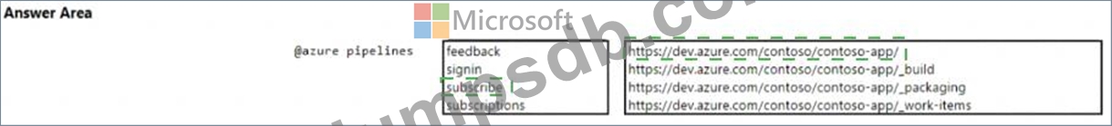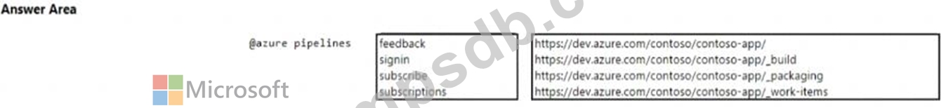 You have a project in Azure DevOps named Contoso App that contains pipelines in Azure Pipelines for GitHub repositories. You need to ensure that developers receive Microsoft Teams notifications when there are failures in a pipeline of Contoso App. What should you run in Teams? To answer, select the appropriate options in the answer area. NOTE: Each correct selection is worth one point.