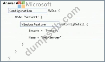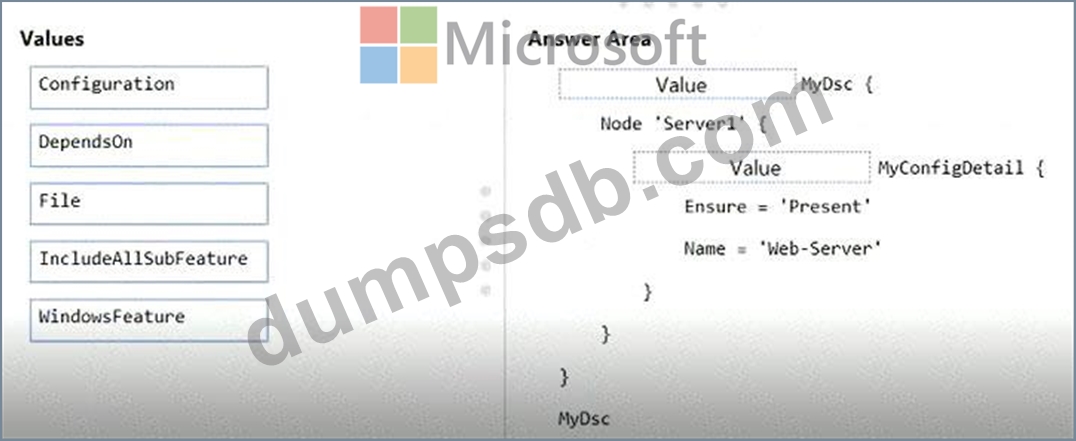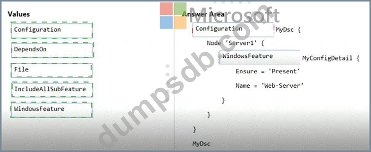 How should you complete the Desired State Configuration (DSQ configuration script? To answer, drag the appropriate values to the correct locations. Each value may be used once, more than once, or not at all. You may need to drag the split bar between panes or scroll to view content.