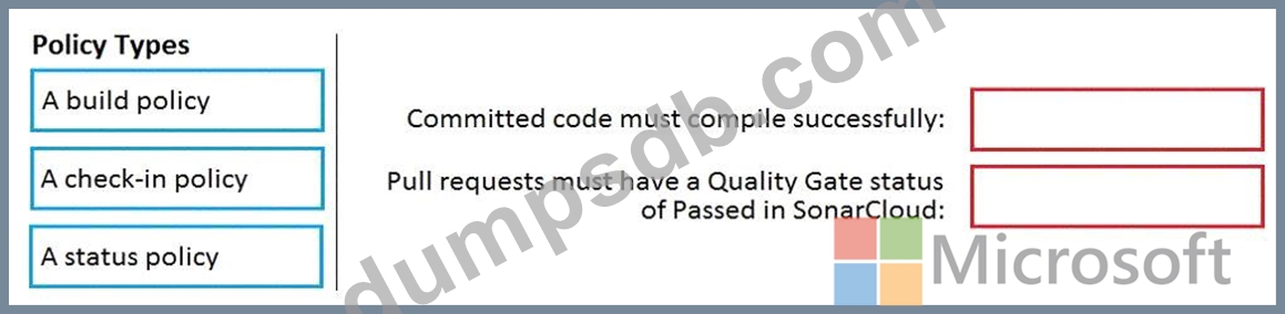 Which policy type should you configure for each requirement? To answer, drag the appropriate policy types to the correct requirements. Each policy type may be used once, more than once, or not at all. You may need to drag the split bar between panes or scroll to view content.