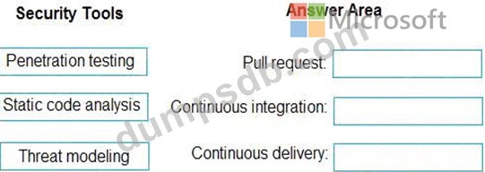 Which type of security tool should you recommend for each stage of the development process? To answer, drag the appropriate security toots to the correct stages. Each security tool may be used once, more than once, or not at all. You may need to drag the split bar between panes or scroll to view content NOTE: Each correct selection is worth one point.
