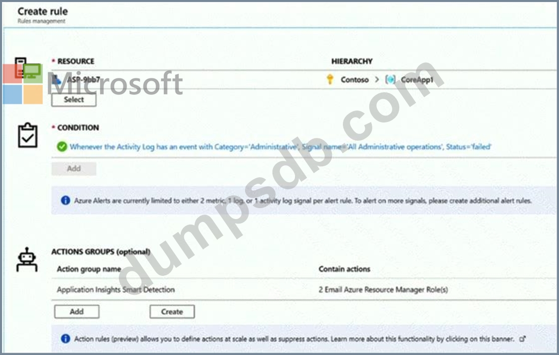 You create an alert rule in Azure Monitor as shown in the following exhibit.