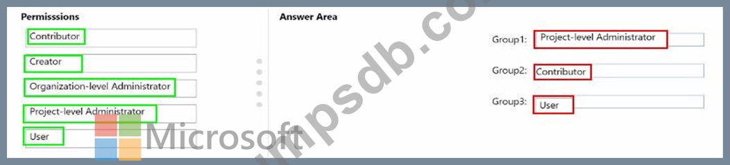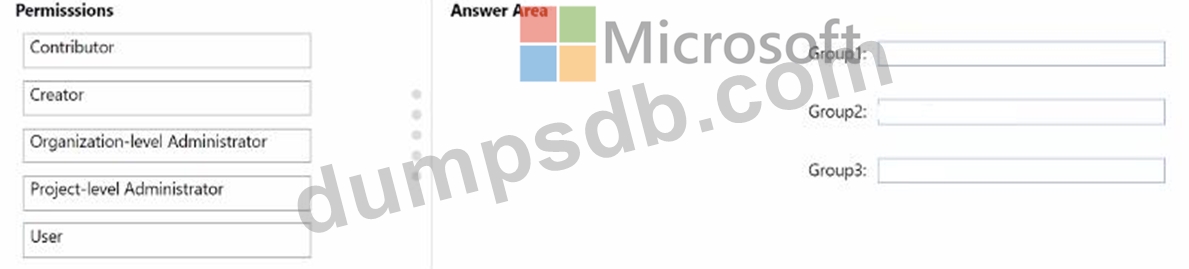 Which permission should you grant to each group? To answer, drag the appropriate permissions to the correct groups. Each permission may be used once, more than once, or not at all. You may need to drag the split bar between panes or scroll to view content.
