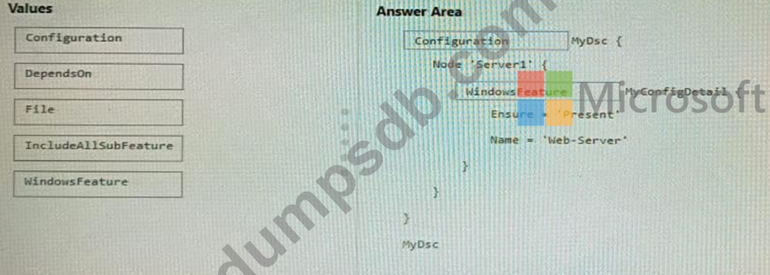 How should you complete the Desired State Configuration (DSC) configuration script? To answer, drag the appropriate values to the correct locations. Each value may be used once, more than once, or not at all. You may need to drag the split bar between panes or scroll to view content.