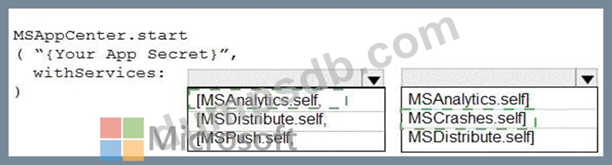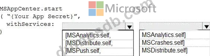 How should you complete the code to initialize App Center in the mobile application? To answer, select the appropriate options in the answer area.