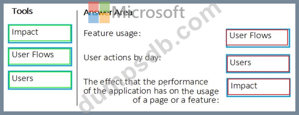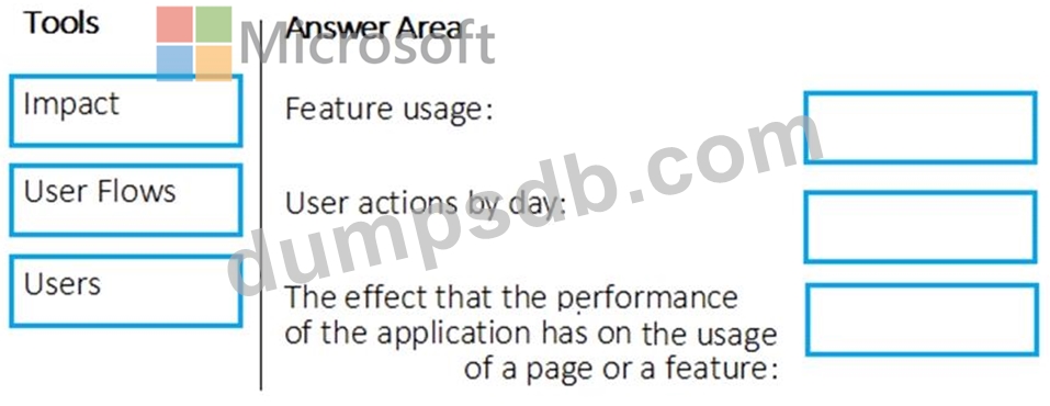 Which application Insights tool should you use to analyze each behavior? To answer, drag the appropriate tools to the correct behaviors. Each tool may be used once, more than once, or not at all. You may need to drag the split bar between panes or scroll to view content.