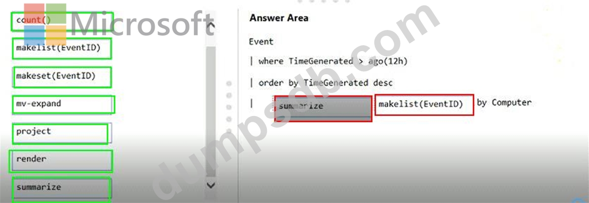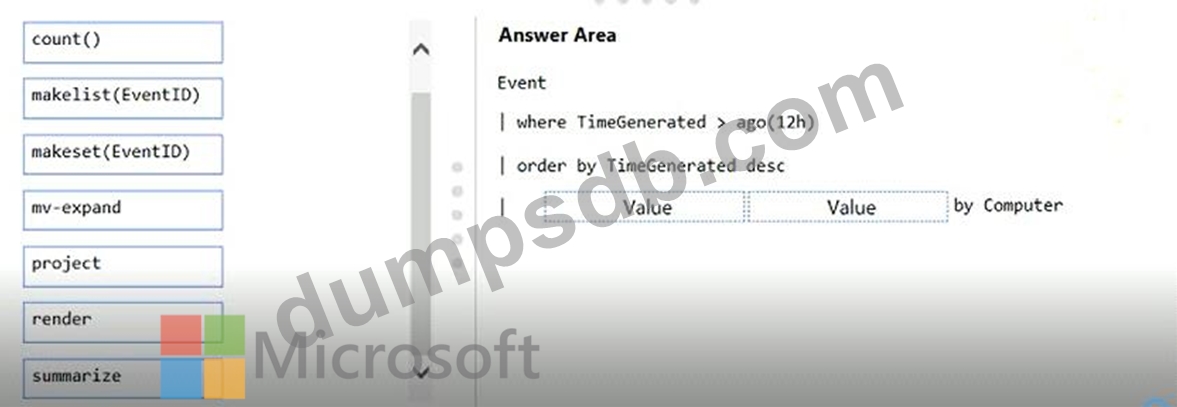 How should you complete the Azure Monitor query? To answer, drag the appropriate values to the correct locations. Each value may be used once, more than once, or not at all. You may need to drag the split bar between panes or scroll to view content.