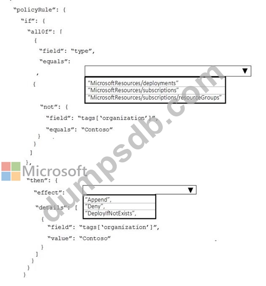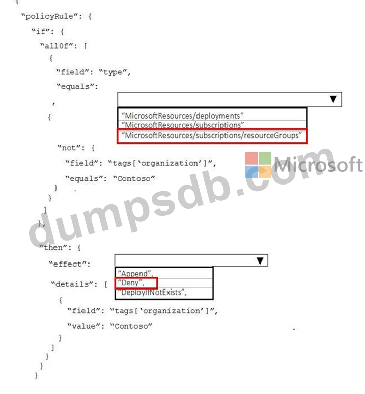 The company requires that all resource group in the subscription have a tag named organization set to a value of Contoso.