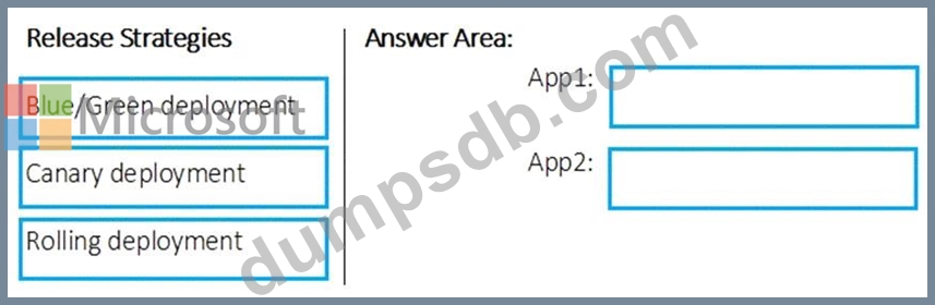 Which release strategy should you use for each application? To answer, drag the appropriate release strategies to the correct applications. Each release strategy may be used once, more than once, or not at all. You may need to drag the split bar between panes or scroll to view content.