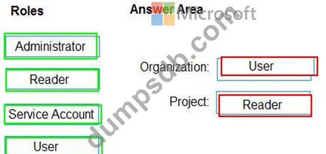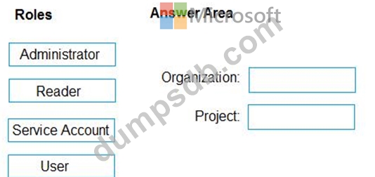 Which role memberships are required for the Azure 0e%Oos organization and the project? To answer, drag the appropriate role membership to the correct targets. Each role membership may be used once, more than once, or not at all. You may need to drag the split bar between panes or scroll to content NOTE: Each correct selection is worth one point.