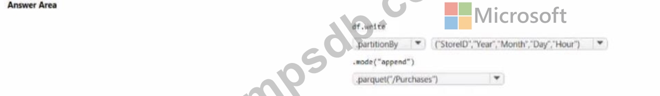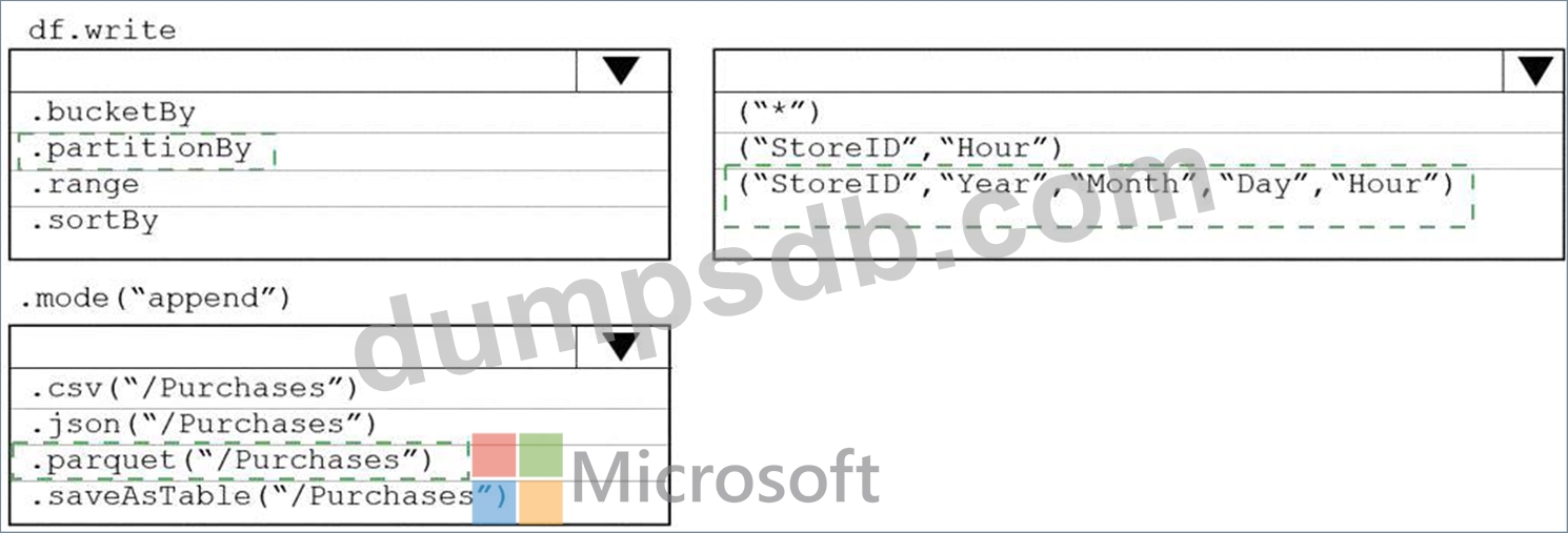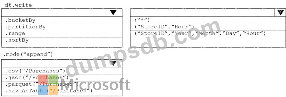 You need to store the data to support hourly incremental load pipelines that will vary for each StoreID. the solution must minimize storage costs. How should you complete the rode? To answer, select the appropriate options In the answer area.